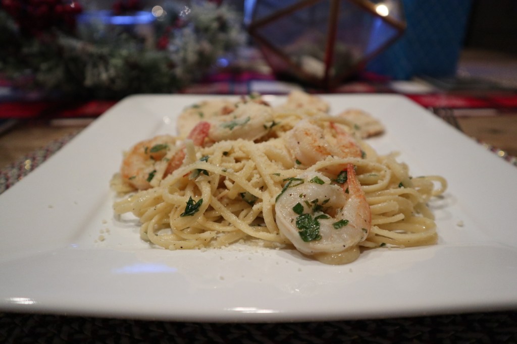 This evening, Cathy decided to try to cook Shrimp Scampi for the first time…and boy did she nail it. Probably my 2nd most favorite dish she has made me. Can’t go wrong with seafood, butter, garlic, and more butter and garlic…o yea and of course her famous banana nut bread!
